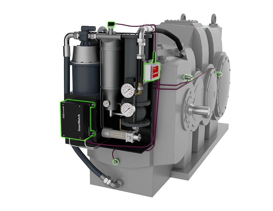 GearWatch voidaan räätälöidä käyttöparametrien mukaan, ja kaikki tiedot ovat vaihteistoasiantuntijoiden valvonnassa valvontakeskuksessamme. Sen lisäksi, että se mittaa muutoksia vaihteistossa, se voi tarvittaessa valvoa myös kaikkia muita laitteita, kuten moottoreita, hydrauliikkajärjestelmiä ja laakereita.
